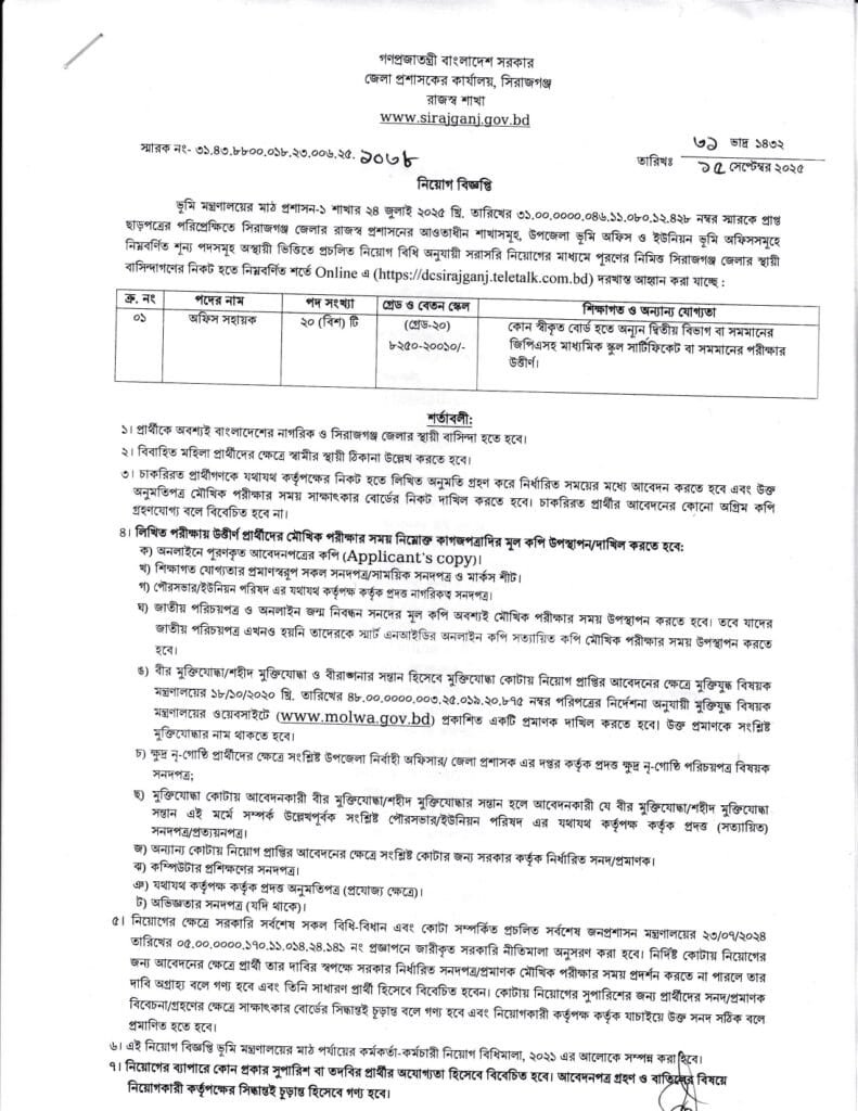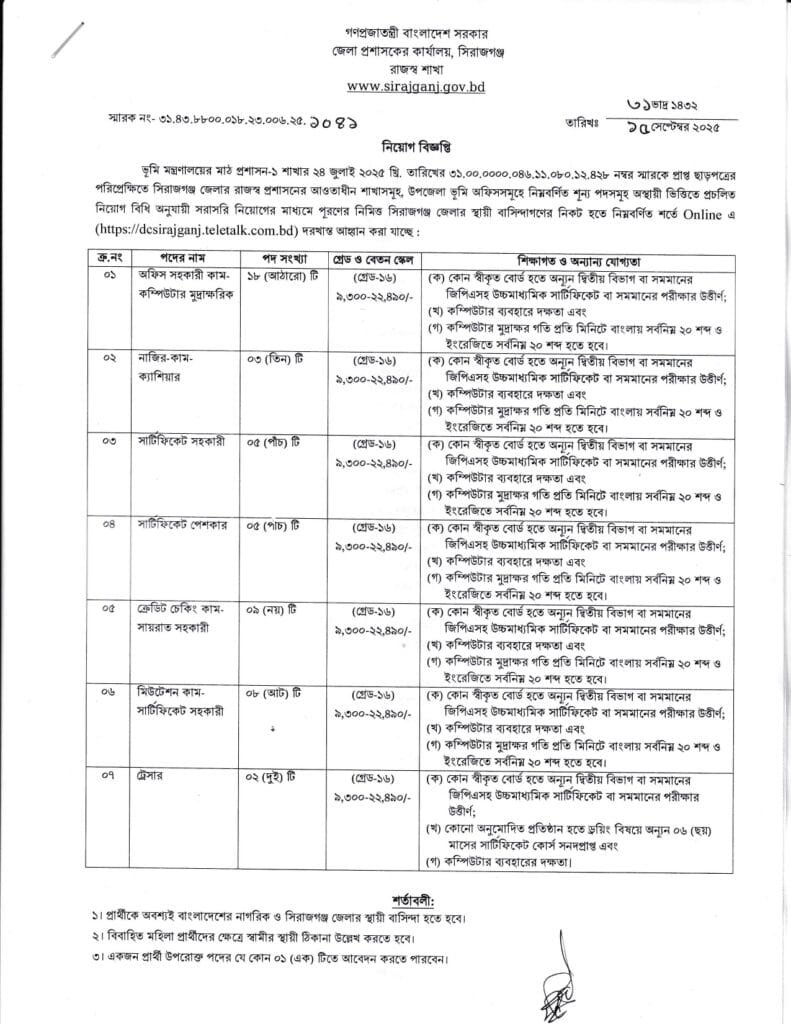 The recent DC office job circular 2025 might be a great opportunity for you if you are looking for a government job in Bangladesh. The Deputy Commissioner’s Office, Sirajganj (Revenue Branch), has issued 2 recruitment notices for 70 posts. In circular 01, there are 7 categories under Grade-16 with a pay scale of 9,300–22,490 BDT. In circular 02, there are Grade-20 Office Assistant posts. You can apply for the job listed in dcsirajganj Teletalk Website from 18 September 2025 (10:00 AM) to 17 October 2025 (5:00 PM). This article gives you details about the posts, eligibility age limit, salary, documents, fees and application process in one place. DC Office Sirajganj Job Circular 2025 Apply Online