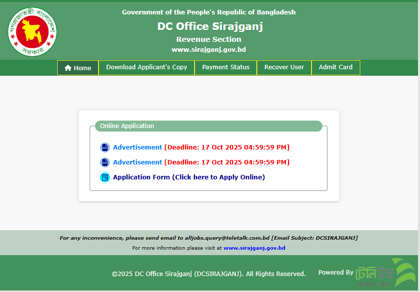 • Apply link: dcsirajganj.teletalk.com.bd.