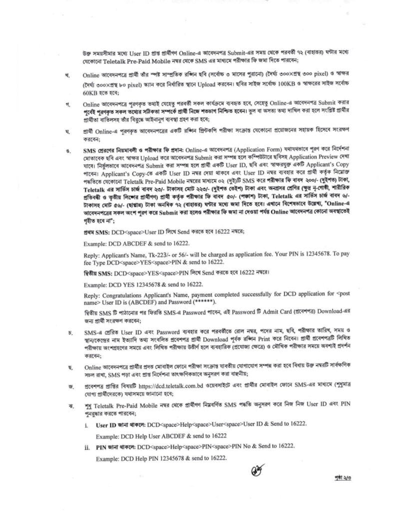 - প্রবেশপত্র এসএমএস এবং dcd.teletalk.com.bd ঠিকানায় জানানো হবে।